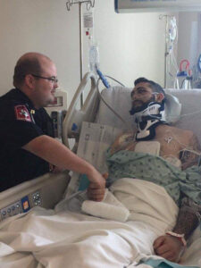 I suffered from traumatic cardiac arrest, which nationally has a rate of less than one percent chance of survival. I had no heartbeat for several minutes during the extrication from my vehicle and en route to the hospital. I had nearly fifty total injuries, broken neck, several ribs, shoulders, collar bones, sternum, legs, and bones in my face. My liver was lacerated, both lungs collapsed, my chest was burned and I bled out. During transport to the hospital, the paramedics performed CPR, intubation and cut my chest open in order to release air surrounding my lungs.