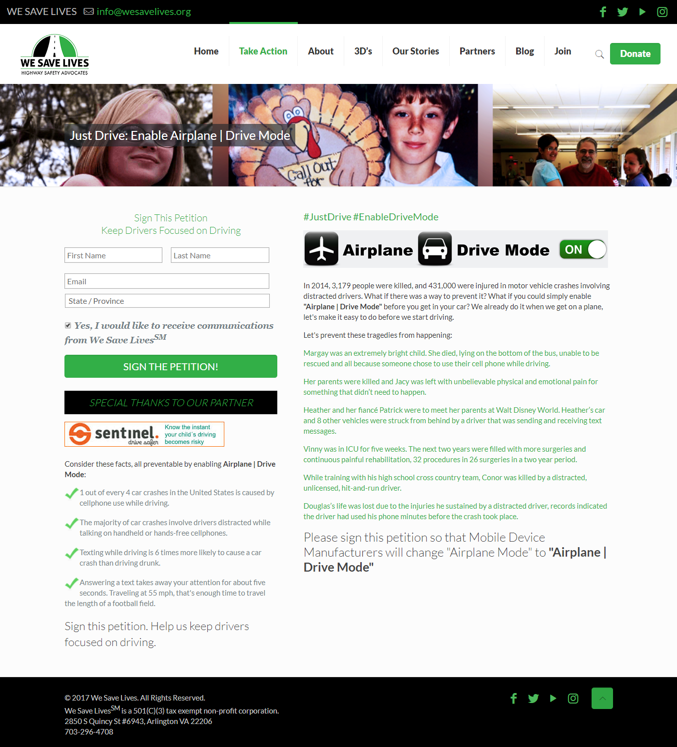 Several years ago, I was hit from behind by a woman who admitted she was distracted, told the police officer she was distracted, yet her ticket said, “driving too close.” I know the crime is under reported. Yet despite the numbers stated, the public does not take it seriously. A survey found that 98 percent of drivers think texting while driving is dangerous, but 66 percent still admit to doing it; 47 percent between the ages of 25 and 34 believe texting behind the wheel is acceptable. Even as you read this, you can probably recall times when you’ve called friends or family, and they answered the phone while driving. If someone calls me while theyare driving, I hang up. I don’t want to be the last call they made before killing themselves or someone else. That is why I introduced several initiatives through my organization, We Save Lives. The first was a campaign called #BUTNOTWHILEDRIVING. Another campaign, Just Drive: Enable Airplane/Drive Mode, was a petition asking Apple to add a “Do Not Disturb While Driving” feature to their mobile devices. They did. But we need your ACTION to make distracted driving socially unacceptable. Please add and use drive mode on your mobile device. It is so easy to do. People can still reach you if it is an emergency. By doing this you are letting people know that you are focusing on your driving and can reach them later.